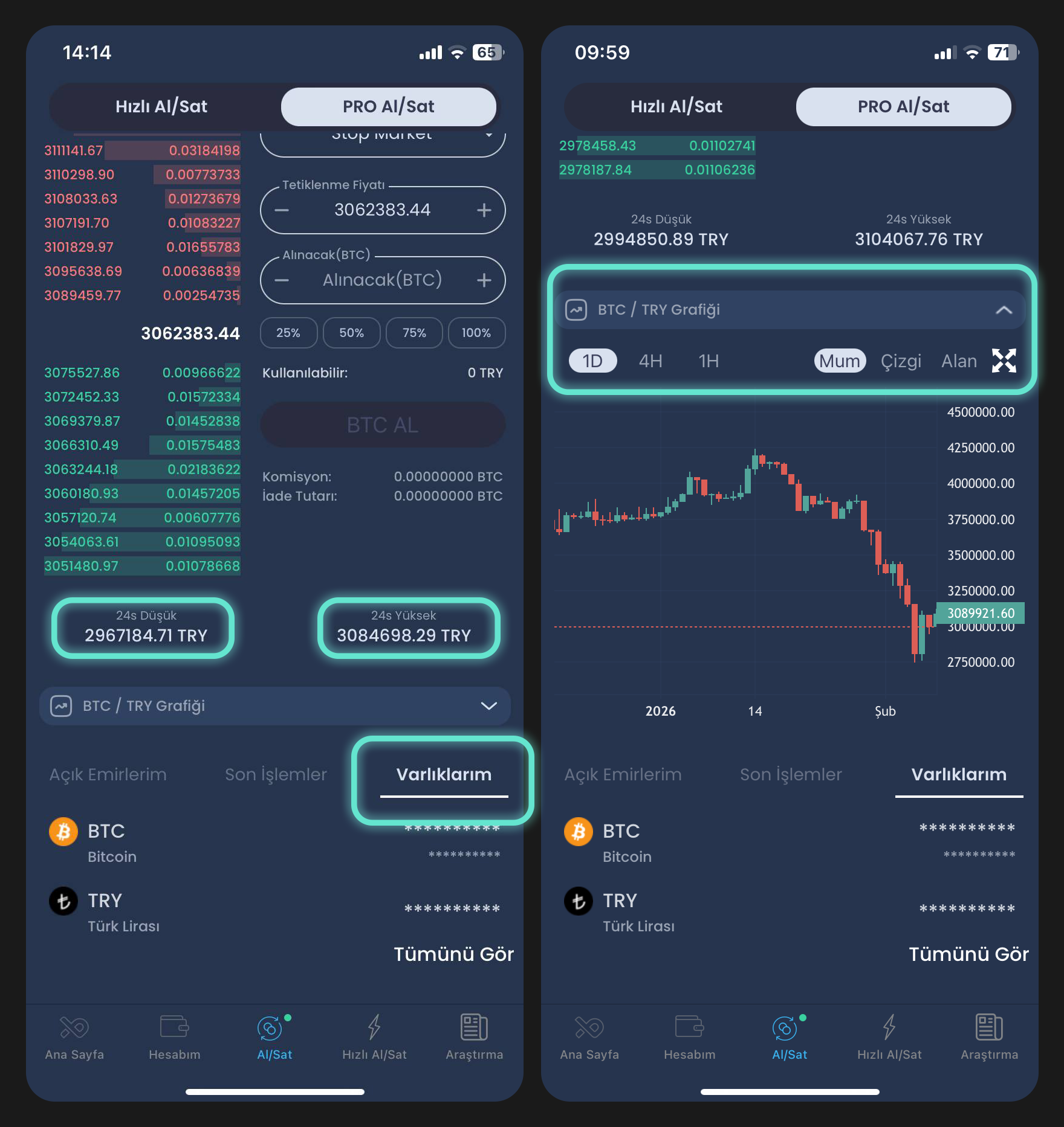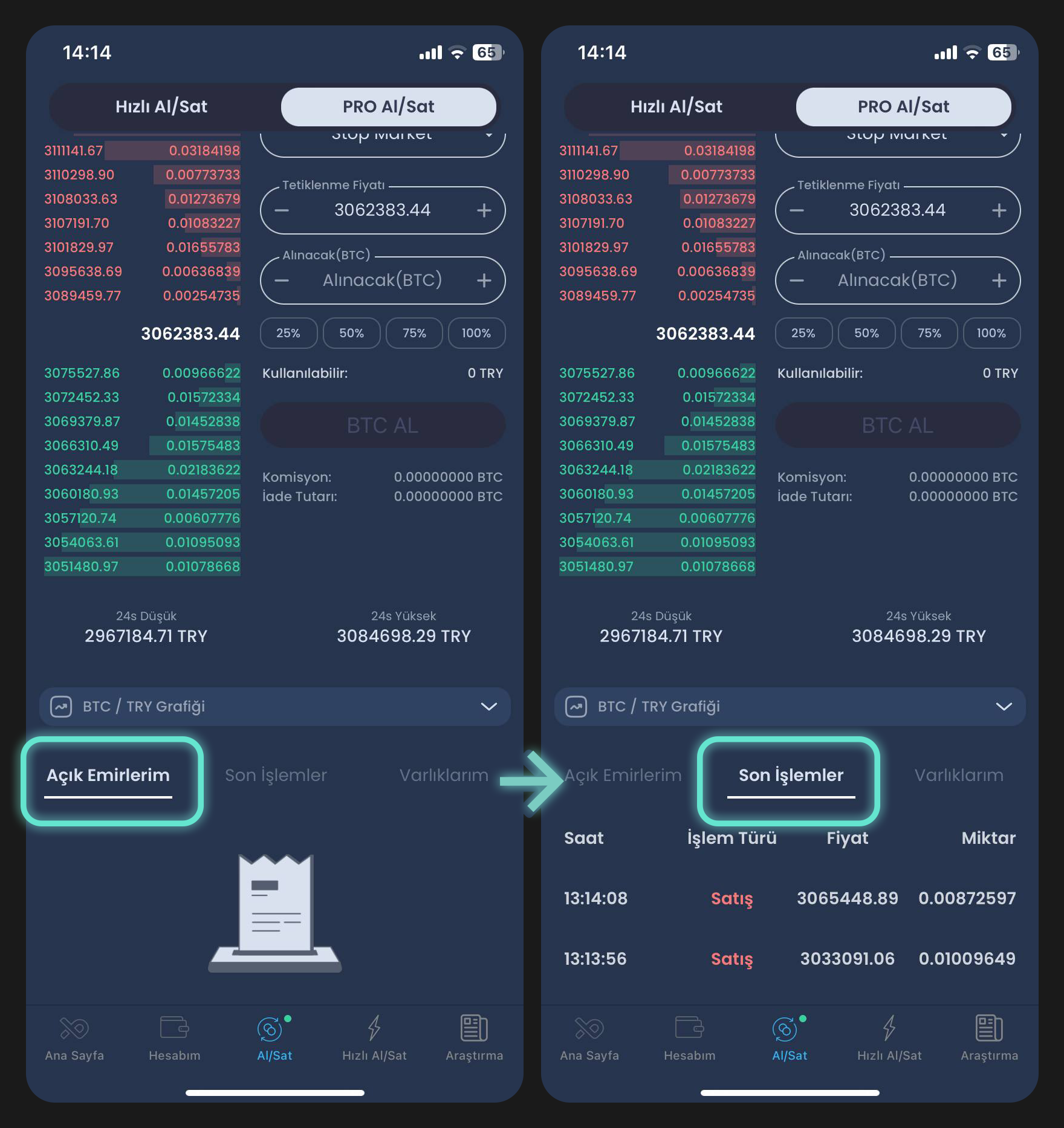 PRO Al/Sat ekranının alt bölümünde: