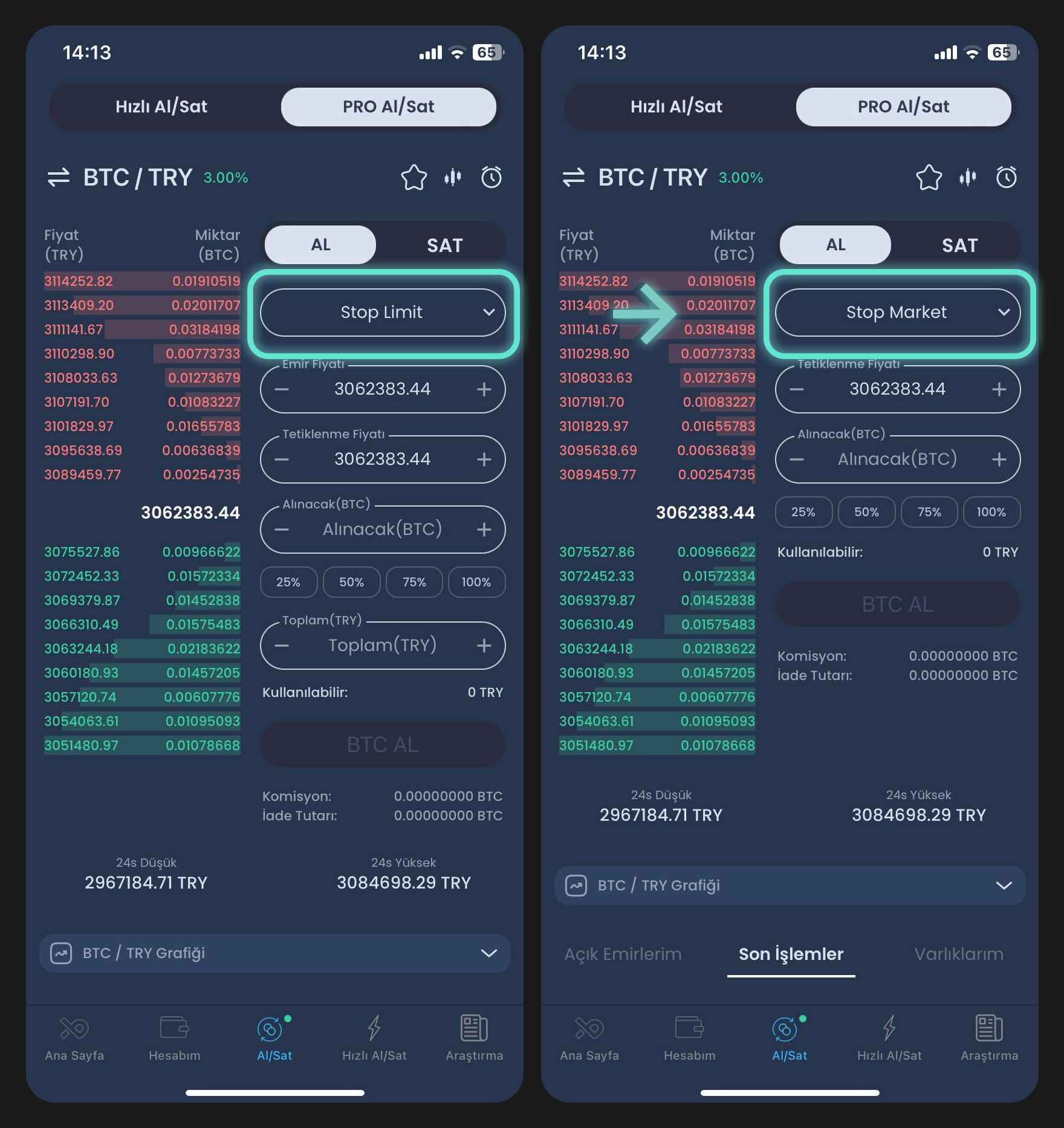 Yeni PRO Al/Sat ekranı, farklı emir türlerini tek bir alanda
